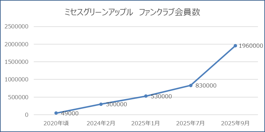 私は約5年ほどMrs. GREEN APPLEを応援している“ジャムズ”の一人ですが、最近、家族が2025年9月に新たにファンクラブに入会したのですが、そのときの会員番号がなんと196万番台後半でした。
